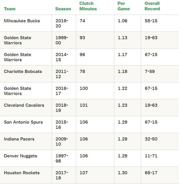雄鹿队不仅这个赛季很少与对手打出势均力敌的比赛,而且他们经常以巨大优势结束比赛。2019-20赛季的雄鹿队比1996-17赛季至今的任何球队打过的关键时刻都要少。自从NBA在1996-97赛季引入了高阶数据库,本赛季的雄鹿很少陷入最后五分钟分差在五分的比赛。即使比赛的次数经过了调整,这个说法仍然是正确的。