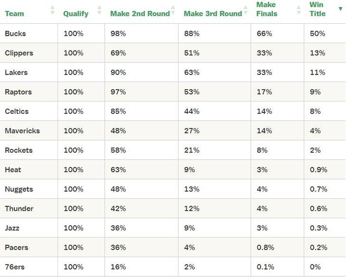 下面让我们看看另外12支队伍(见下图)所面临的同样问题,从之前的赔率来看,他们是最有可能进入到季后赛第二轮的球队。我们会根据队伍关键时刻阵容的情况将他们分成几个类别,然后选出至少出场了20%的关键时间的球员。在我们开始之前,有一点需要注意,面临不确定性的不仅仅是雄鹿队。尽管人们常说教练在比赛快结束时,需要五名他们可以信任的球员,但2019-20赛季季后赛即将到来之际,很少有球员可以真正定义关键时刻的阵容。