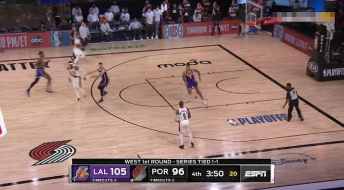湖人开拓者G3第四节3分55秒,此时的开拓者96-105落后9分,按照时间来讲,他们完全有追分的希望,并且这一回合,安东尼还在背后完成抢断,开拓者顺势推动反击。