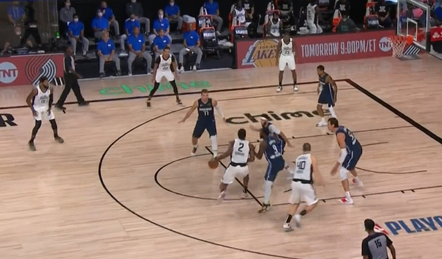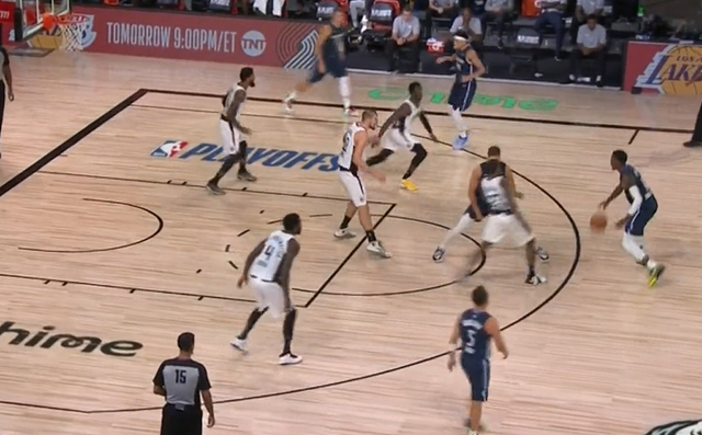 独行侠疯狂地包夹伦纳德。这当然会在外线漏出空档,独行侠靠自己后卫多跑得快去补,如果补不上也就认了,宁可让快船投空位三分也不愿意让伦纳德单打。如果让伦纳德单打的话就是完全“白给”,放空外线三分至少还能赌对手不准。