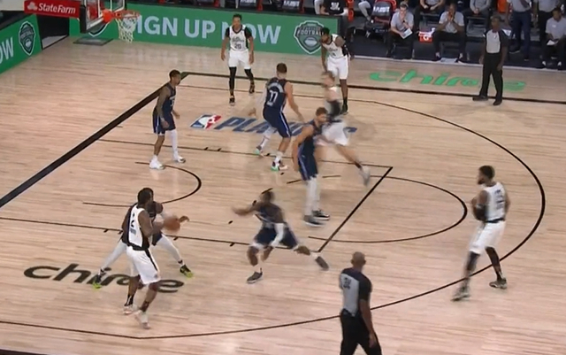 慢三步、欧洲步、后卫梦幻脚步、顶开防守后接后仰抛投打板……东契奇强行攻篮下,秀出了十八般武艺,像刻俄柏一样什么武器都能信手拈来。