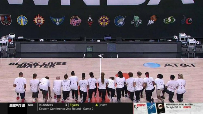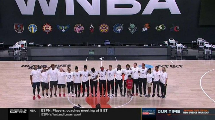WNBA六支球队球员(华盛顿神秘人、亚特兰大梦想、明尼苏达山猫、康涅狄格太阳、菲尼克斯水星、洛杉矶火花),在球场中手挽着手并单膝跪地,用T恤上的字母拼出了Jacob Blake名字,同时每件T恤后面均有7个洞。