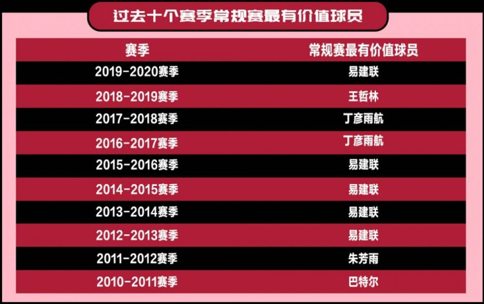 CBA近10年常规赛MVP:易建联5度当选 曾完成四连庄