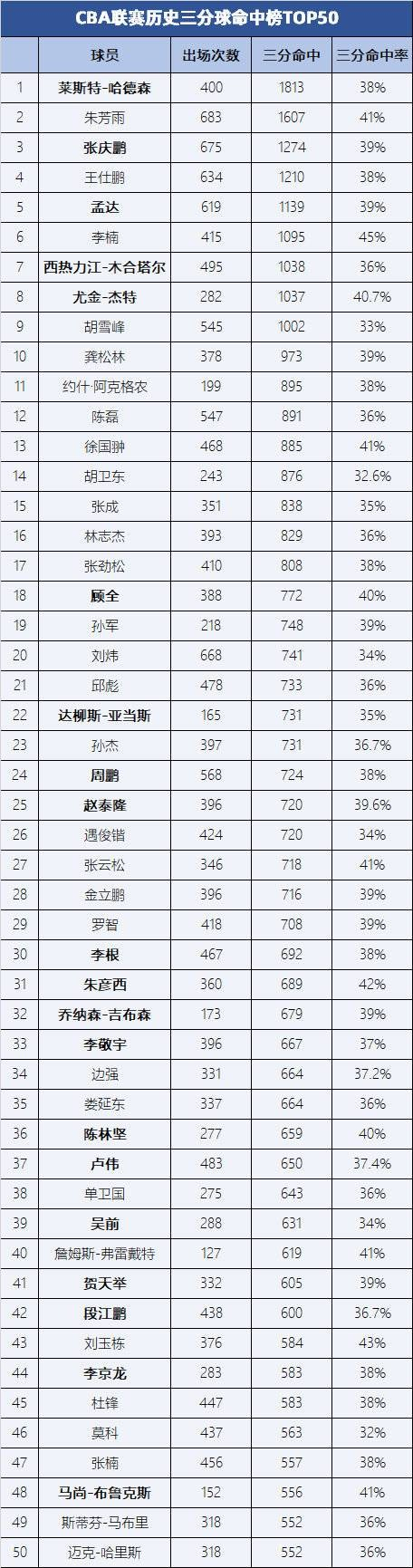 CBA官方盘点历史三分球命中数Top50 哈德森榜首朱八本土第1