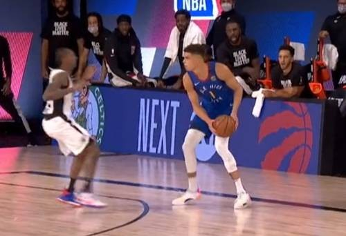 暂停之后,掘金以约基奇、米尔萨普两腰单挑发起,吸引夹击,联动翼侧克雷格启动突分中转,全队为状态神勇的老将米尔萨普做球,掘金一度将分差缩小至6分。