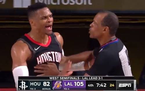 下半场,湖人继续在三分线外直接夹击哈登,塔克用空位三分惩罚湖人,辅以哈登转换奔袭、威少单挑浓眉,火箭因哈登遭遇夹击只能和湖人赌三分以及比拼其他人的单打效率。