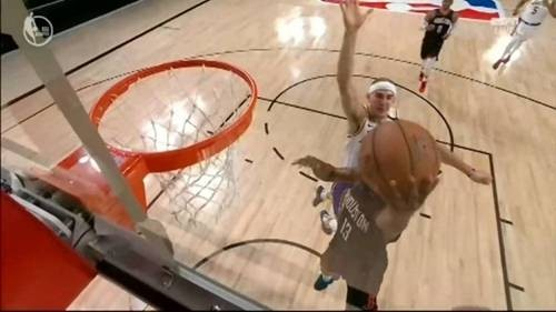 德安东尼进行调整,哈登+杰夫-格林中线挡拆启动,为哈登创造长距离加速攻筐的进攻空间;戈登与哈登同站强侧缓解哈登遭遇的夹击压力,戈登主导突分联动杰夫-格林渗透禁区。湖人以隆多控场,球领人走:内找浓眉两腰接球策应,呼应波普、库兹马弱侧启动抄后门袭筐;外找库兹马与波普交叉走位后接球三分,湖人建立起22分领先优势。