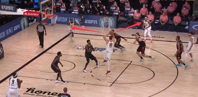 比如这个回合,约基奇低位逼迫乔治夹击,穆雷牵制贝弗利,哈里斯空切,弱侧格兰特提上(创造传球路线),伦纳德被迫在哈里斯和格兰特之间二选一。