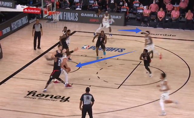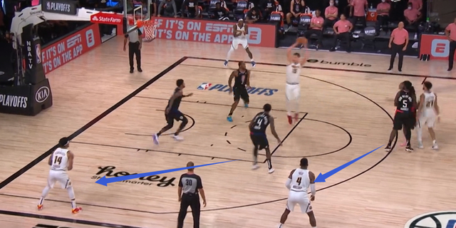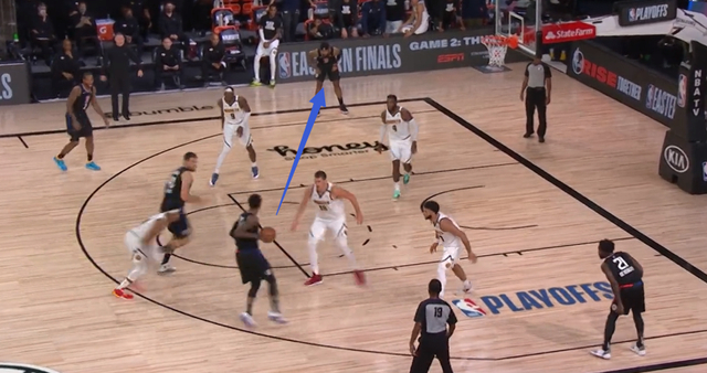 比如我们已经知道掘金在防守挡拆时会让约基奇提上、弱侧底角防守人来补防,于是我们看到快船在一些回合中创造了让弱侧底角防守人无法补防的情况: