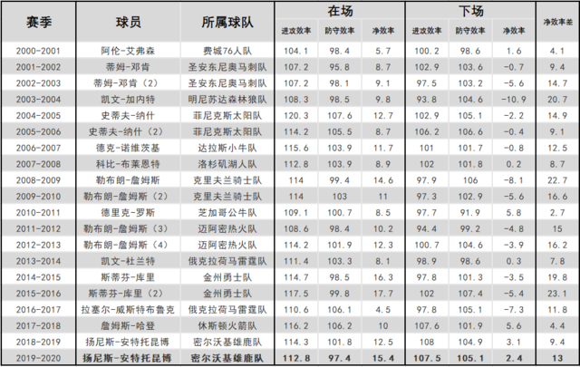 然而这却使得安特托昆博今年的数据更加疯狂和恐怖,每一百个回合当中,他能够砍下43.2分19.9个篮板以及8.2次的助攻。放眼过去20年里,在得分上仅有2016-17赛季上演史无前例的个人表现的拉塞尔-威斯布鲁克要优于他;篮板方面更是无人能及,甚至于领先04年的加内特将近1.0个。因此从基础数据上来看,安特托昆博绝对不是最“水”的那个。