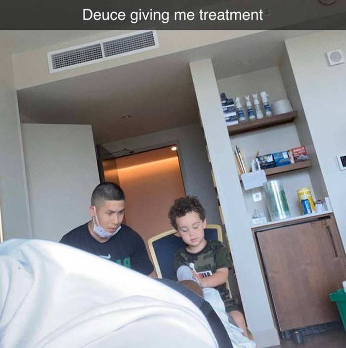 赛前,凯尔特人球星塔图姆在个人社媒晒出儿子Deuce和球队理疗师Nick Sang学习的图片,小朋友在认真地给爸爸做按摩。