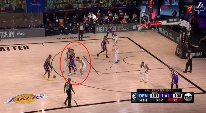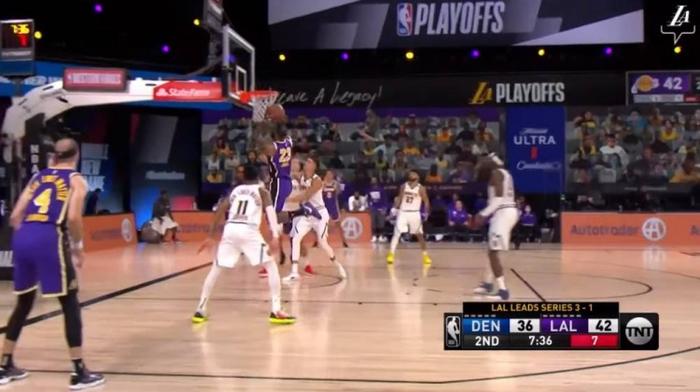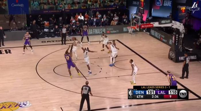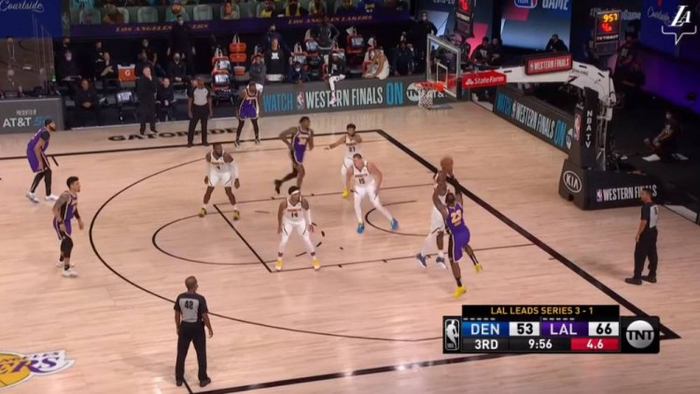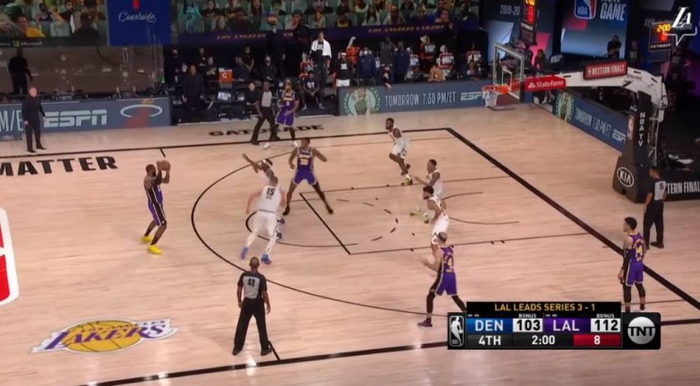还是弧顶的挡拆,霍华德的顺下,让格兰特和约基奇一时有些沟通失误,詹姆斯获得投篮空间,毫不手软,状态正热,三分命中,杀死比赛。