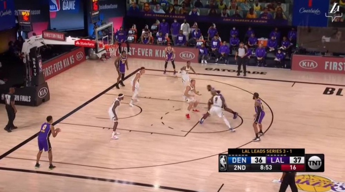 最后连续得分期间,这样借助5号位的挡拆,看准约基奇不敢换防也不敢大延误,然后寻找中距离或者三分的机会,连续出现,而上半场詹姆斯坚决的攻筐又让掘金相当忌惮,里突外投都予取予求的勒布朗,谁又能够阻挡呢?
