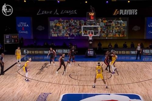 热火不甘心面对无限换防坐以待毙,五小多点奋勇往复突分冲击篮筐,追打大莫里斯、库兹马搭档内线的护筐高度不足,利用湖人大莫里斯逢挡拆缩在篮下的防守漏洞,希罗无球借助定位掩护抢三分;防守端战略性放空三分线外的隆多,局部多夹少,热火一度43-41打停湖人。