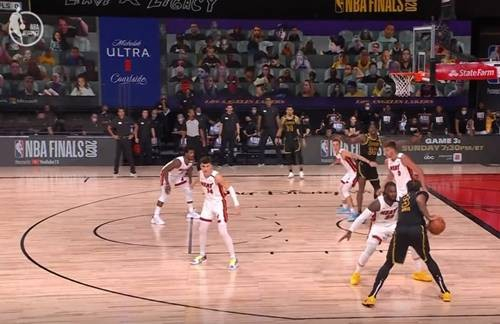 湖人扩防至三分线外,霍师傅、浓眉退守就近落位无限换防,严控热火三分球,鼓励热火诸将从三分线外错位追打霍师傅。湖人进攻端以浓眉单挑克劳德发起,低位背身单挑吸引夹击,湖人展开局部多打少,底角埋伏的空位终结点突投结合伺机而动,多点联动霍师傅绝对高度绞杀禁区;勒布朗迅猛推转换,单骑闯关亦或喂饼霍师傅制霸篮下——湖人以绝对高度牢牢掌控比赛节奏,热火被湖人的禁区铜墙铁壁围堵在三秒区外赌中远投效率。