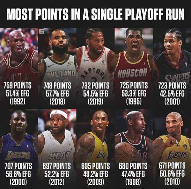 1 乔丹 1992年季后赛一共轰下759分,命中率51.4%;(另一次上榜排在第9名,1998年680分,命中率47.4%)