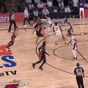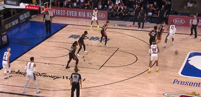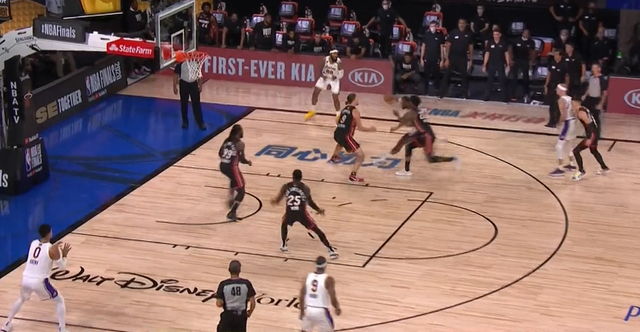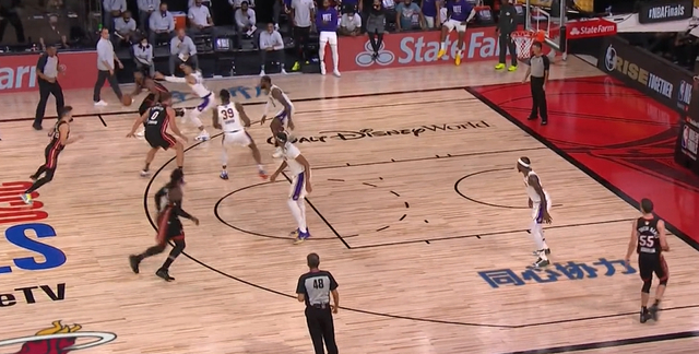 重用射手的牵制和掩护使得湖人的一线防守变得无用:詹姆斯对位防守巴特勒,但根据官网的数据,巴特勒本场面对詹姆斯只得到6分,其余34分均是对位其他人时拿到的(作为对比,詹姆斯在面对巴特勒时拿到9分)。巴特勒通过与射手做挡拆配合,打出了詹姆斯的“点名”战术。