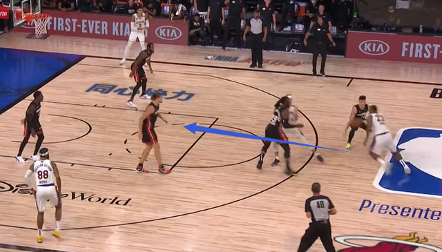 奥利尼克本身又是一个特别狡猾的球员,真掩护假掩护真假难辨,上图中他和巴特勒假装做挡拆,实则奥利尼克在掩护发生前一秒突然转空切顺下,浓眉反应不及,被奥利尼克偷袭篮下。