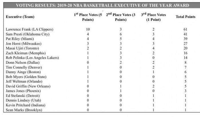 随后,多家记者公布了此次奖项的投票情况,雷霆执行副总裁兼总经理普雷斯蒂位列第2、热火总裁莱利第3,而另一支征战总决赛球队的总经理佩林卡则位列第7。