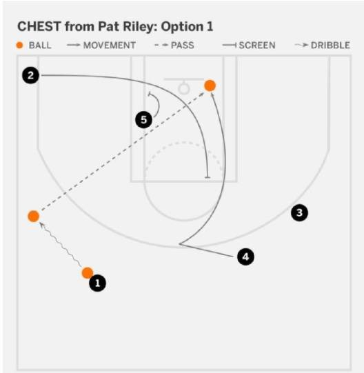 “Chest”战术有很多个版本,韦德和奥尼尔经常打这个战术。目的是一个假掩护,然后顺下空接。大部分情况下韦德会借挡拆或者直接突破到篮下。