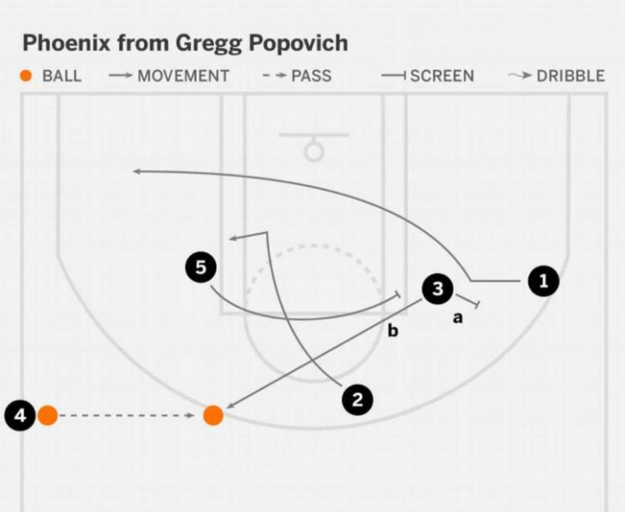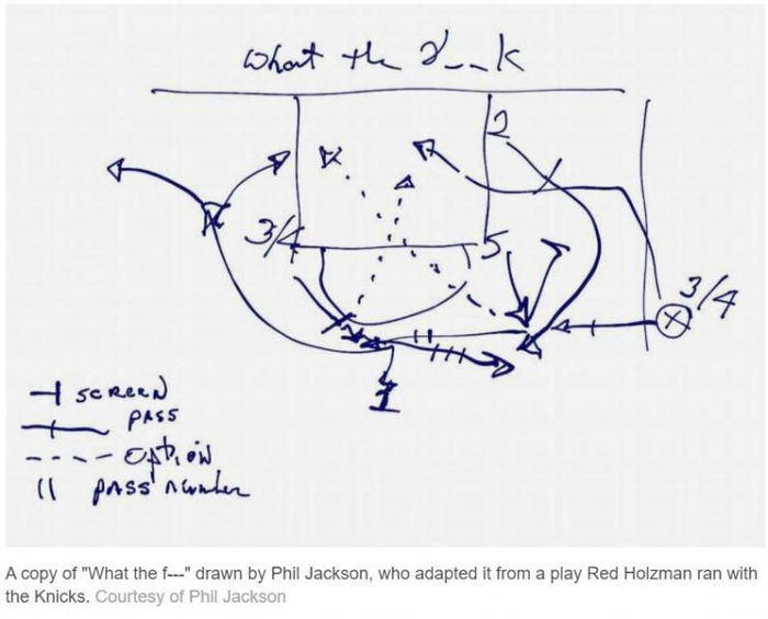 ESPN采访了过去四十年来获得最多冠军的三位主教练(至少执教一千场,以胜率排名)——菲尔-杰克逊,前湖人和热火主教练帕特-莱利,以及马刺队的波波维奇,并且让他们画一个自己最喜欢的战术。禅师画了卧槽战术,莱利从他自吹自擂的五次夺冠系列赛里挑了“5Chest”。波波维奇则是从德安东尼在太阳执教的战术手册里复制过来(见下面波波的手绘版本),一个可以在比赛末期给球队带来空位三分机会的战术。
