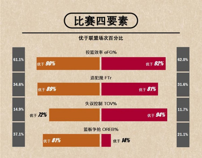 第二个疑问则是,想知道某队进攻或防守端特别好或者不好的具体原因,过往的分析方式可能是直接去看球员的表现,现在则可以针对球队数据进行下一步的拆解,也就是到了比赛四要素的环节。