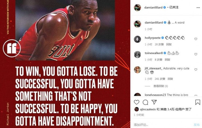 利拉德转发乔丹语录:想要赢球 你需要经历失败
