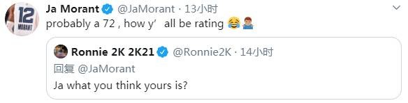 随后,2K管理员罗尼在推特上与莫兰特互动,让后者猜测自己的2K能力值。莫兰特则幽默地回答道:“可能是72吧。”