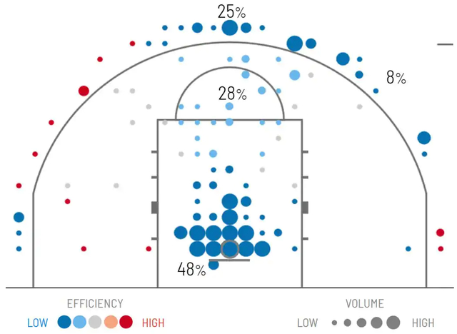 2,他在半场进攻攻击篮筐时每回合能得到1.07分,阵地战出手中有超过一半来自于在篮筐附近的出手。