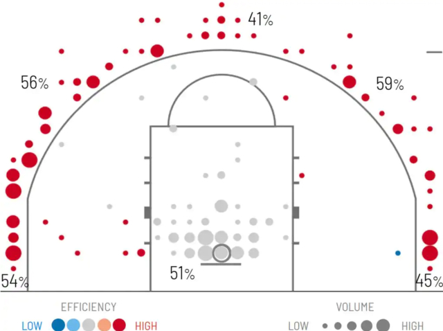 2、内史密斯的身体调整能力很强,这使他在运动状态下也能够保持良好手感,上赛季他平均每次运球跳投能够得到0.919分,该数据超过了全联盟78%的球员。