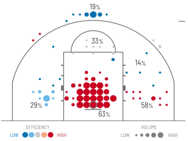 3、优秀的进攻篮板手,在转换进攻中会非常努力的去尝试击败对方的大个子,每回合篮下出手能够得到1.25分(前26%)。