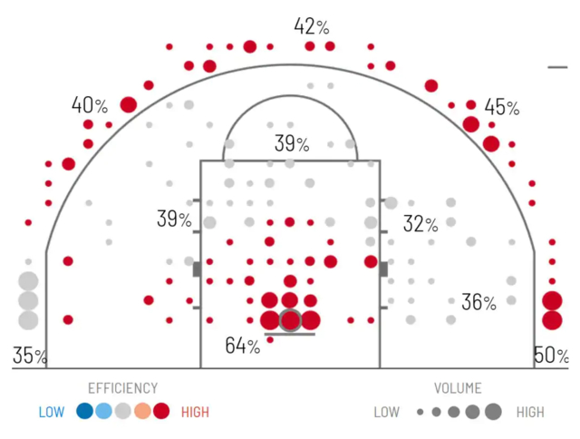 2、在攻防转换中很有威胁,也可以通过挡拆进攻为自己创造投篮机会。