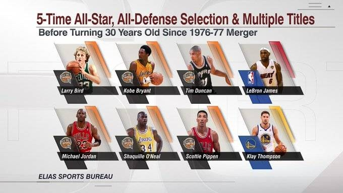 直播吧11月20日讯 据美媒EliasSports统计,1976-77赛季(NBA与ABA在该赛季完成合并)以来,在30岁之前就至少5次进入全明星、并且入选过最佳防守阵容、同时拿过多次总冠军的球员,只有伯德、乔丹、皮蓬、奥尼尔、科比、邓肯、詹姆斯、克莱-汤普森。