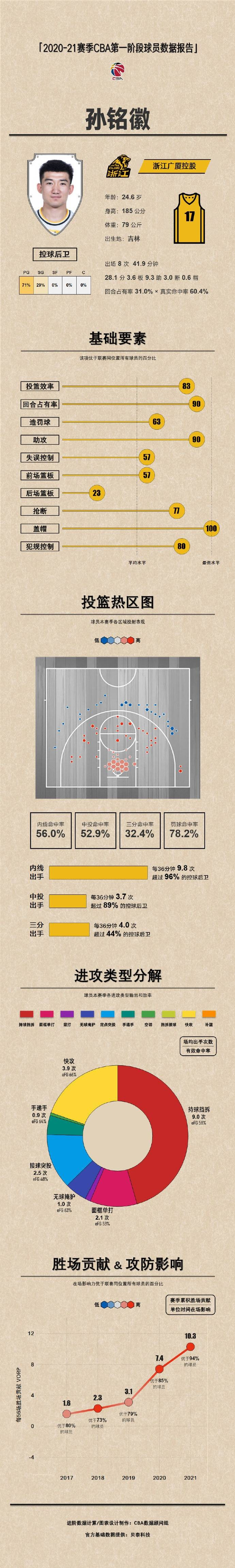 【孙铭徽】:得分高产且高效的挡拆型控卫,球风侵略性强,擅长突破攻框终结和分球,能造罚球,快攻极其凶猛。防守同样充满侵略性,抢断率极佳,且很少犯规。