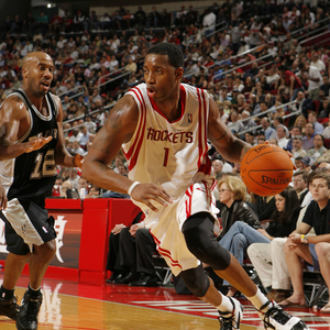 火箭边线球紧逼布朗,布朗运球失误,麦迪拿到球权,冲至前场三分线左侧弧顶,急停三分,再次命中,反超比分!