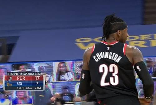 开拓者防守端眼中仅有库里一人,斯托茨派瘦高臂长的扣篮王小琼斯主防库里,小琼斯4犯后则是西蒙斯、利拉德、考文顿、CJ-麦科勒姆轮番车轮战消耗,三分线外的追梦、乌布雷、怀斯曼一律战略性放投——优先逢挡拆堵中路放两翼边角三分球,全军像抓泥鳅一样对库里围追堵截,换防、夹击、绕掩护无所不用其极,只抓主要矛盾,BOX1战术如影随形,所有的防守布置只针对库里展开,毕竟克莱不在,其他人没有稳定的得分能力,按住库里等于锁死了勇士。