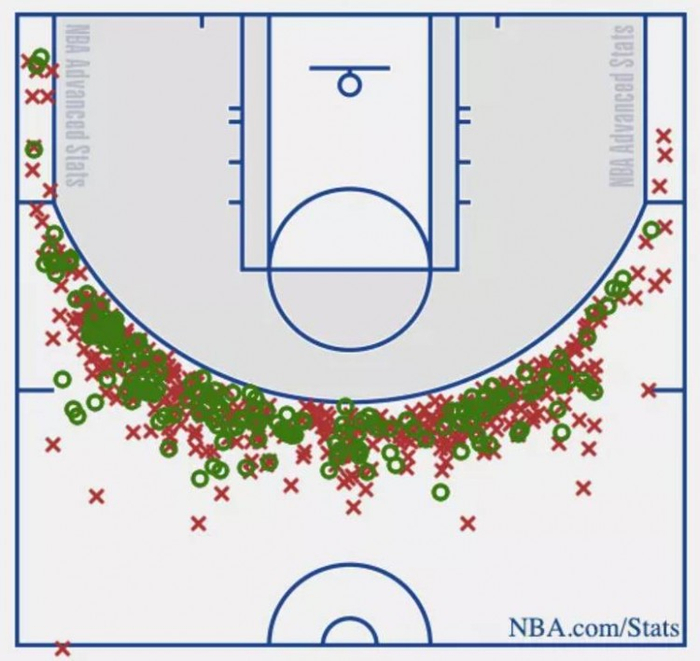 和库里在2018-19赛季的表现来对比一下,看看东契奇与“NBA第一射手”之间的差距。看看库里的出手范围吧,无死角地覆盖了整个三分线。看过勇士比赛的朋友一定对这样一个战术不陌生,库里分球给底角的队友然后迅速跑到队友身后,接队友的穿裆传球出手三分。这就是勇士队战术理念的一个缩影——虽然总是有人吐槽库里不应该打如此多的无球,但库里的无球不仅解放了球队的进攻空间,也一定程度上解放了他自己。(那个赛季,库里的三分球命中率高达42.9%,底角三分命中率达到了恐怖的50.4%。)