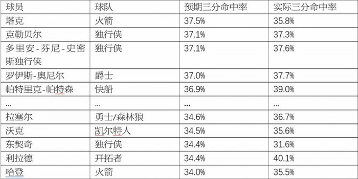 以下这张图表展示了上个赛季出手三分球至少100次的球员中,“预期三分命中率”最高和最低的五个球员。预期三分命中率越低,代表出手难度越高;反之代表出手难度越低。