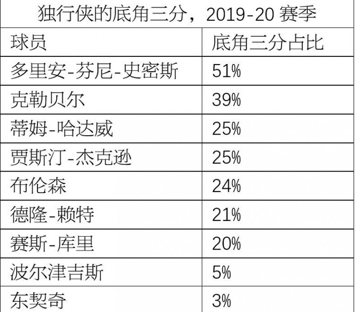独行侠超高的进攻效率得益于他们在进攻端得到的空间。上赛季,独行侠除东契奇和波尔津吉斯外的所有球员,均有20%以上的三分出手来自底角。(波神的数据和东契奇不能一概而论。内线球员很少会拉到底角去出手三分,整个联盟都是如此。上个赛季,武切维奇、恩比德、约基奇的底角三分占比都在5%以下。)