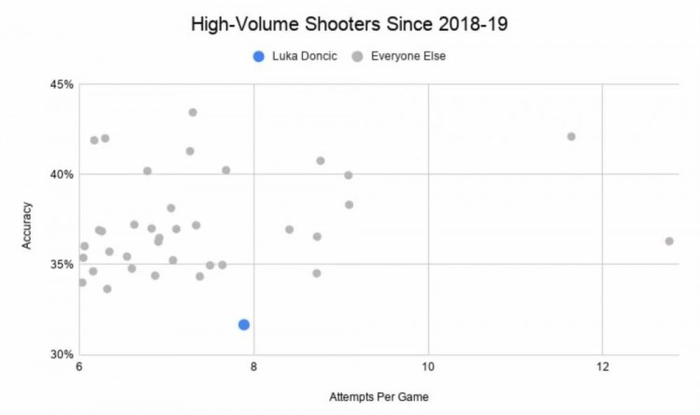 因此,东契奇的问题就是,他的确出手了很多三分,但是他的命中率非常低。
