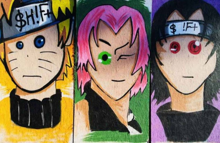 我工作室的小伙伴都喜欢动漫和火影忍者的故事,这简直就是我们的圣经。画里面是三位火影的主要角色,从左到右依次是鸣人、小樱和佐助。头戴上的标识是我们工作室小伙伴们的身份标志,你会看到我在Ins上晒出来的。