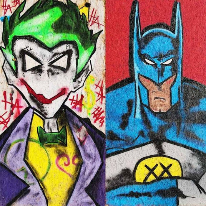 我和女友的关系就像是这幅画一样,她是蝙蝠侠,我是小丑。这是我们一起创作的,她喜欢创作过程中的我。那天我在车库里画画,让女友把颜料罐扔到画作上,所以小丑的衣服和背景里一些随机的东西就是她的杰作。除此之外,背景和衣服上的一些小标志也是她加上去的。