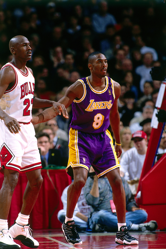 1996年12月18日,湖人客场挑战公牛,这是科比第一次与“飞人”乔丹同场竞技,本场比赛乔丹轻松写意的拿下了30分9个篮板和3次助攻,而仅仅出场10分钟的科比只收获5分1次助攻。如果说面对同样年轻的斯塔克豪斯,科比尚能一战,那么见到篮球之神,科比才意识到他与超级巨星之间鸿沟一般的差距,那场比赛过后,好胜心极强的科比在继续崇拜乔丹的同时,心里暗下决心,一定要发愤图强、后来居上。一年后的同一天,湖人同样客场挑战公牛,科比在乔丹面前拿到了当时的个人生涯最高分33分,这是后话。