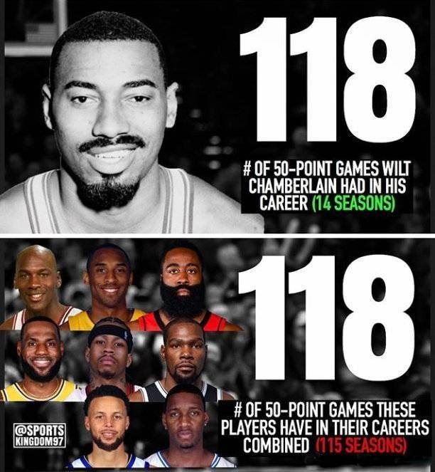 张伯伦的新秀赛季对于他本人平平无奇,对于联盟却是震铄古今。他的处子秀,面对纽约尼克斯砍下了43分和28篮板,这个赛季拿下了场均37.6分+27篮板的数据。