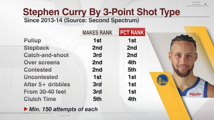 Second Spectrum追踪的数据显示,自2013-14赛季以来,库里在9种类型的三分出手中,命中率和命中数都排名联盟前五,具体如下(类型 命中数 命中率):