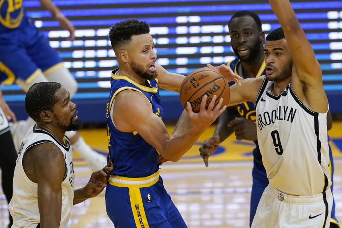 同样是锁死外线空间,同样的内线放空弧顶传切,篮网的三人更能利用好每一个中高位空间,库里则当爹当妈,只能一手串联。本质上在于,除了库里,其他人并不具备面对一对一单打的稳定输出能力,所以篮网可以放心去对付库里。