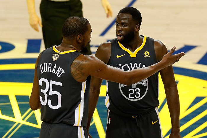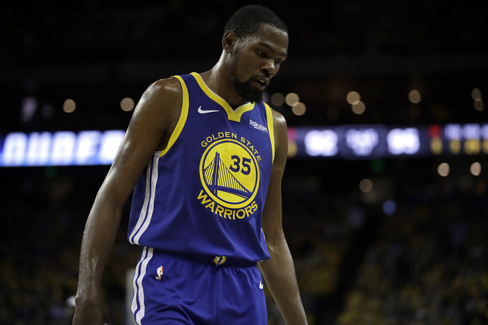 2019年季后赛西部半决赛第五场,勇士和火箭的天王山之战里杜兰特遭遇小腿拉伤,预计缺席一个月以上。勇士凭借库里第六场半场33分的惊艳表现淘汰了火箭,还是成功晋级。赛后勇士在客场更衣室里疯狂庆祝,此时的杜兰特还在主场养伤,只是在Ins上发了一张图片庆祝勇士晋级。西部决赛勇士4比0兵不血刃拿下开拓者,再次打进总决赛,成为了继1957-66年10进总决的凯尔特人之后,第一支连续5年打进总决赛的队伍。