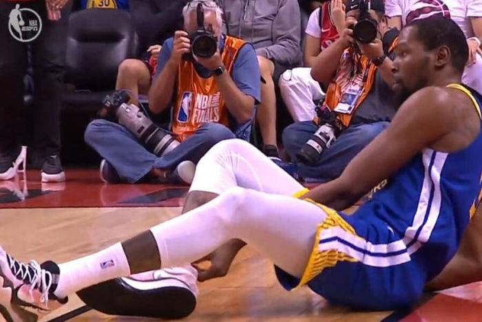 当时外界的讨论主要是杜兰特是否应该带伤出战总决赛,勇士以1比3落后猛龙后,球队的医疗团队和杜兰特的团队都认为可以打第五场。杜兰特登场的前12分钟砍下了11分,看起来并没有受到多少伤病的影响。可距离半场结束还有9分51秒时,杜兰特右脚再次拉上倒在了地上,虽然最后勇士赢下了第五场,将比赛拖进了第六场,但是赛后的更衣室气氛却安静到令人窒息。勇士总经理迈尔斯眼睛湿润地接受了赛后采访,勇士球员也十分默契地沉默下来。三天之后,汤普森又遭遇左膝十字韧带撕裂,猛龙赢下了第六场成功捧杯。