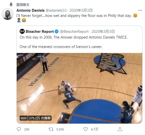 值得一提的是,美媒露天看台在去年的今天,曾转发此视频,有趣的是,丹尼尔斯当时在视频下方回复:“我永远不会忘记……那天费城的地板是有多么湿滑。”这条回复,至今还是丹尼尔斯个人推特的置顶推文。另外,虽然丹尼尔斯本场比赛也有晃倒艾弗森的精彩过人动作,但那球最终的上篮并未打中。
