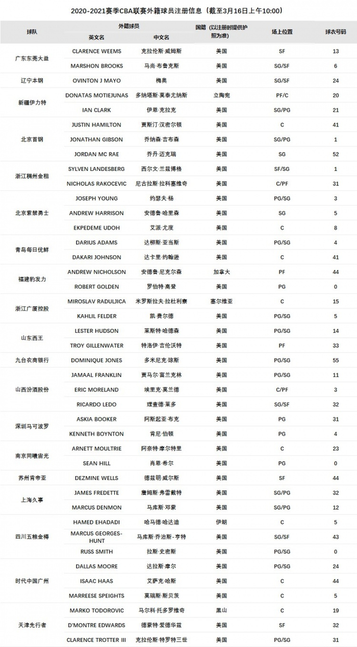 依据《2020-2021赛季CBA联赛国内球员注册、报名管理规定》,2020-2021赛季CBA联赛外籍球员注册期自2019-2020赛季CBA联赛总决赛结束后至2020-2021赛季常规赛最后一轮比赛日当日上午10:00前,CBA联盟在该注册期之外不受理外籍球员注册。本赛季各俱乐部可同时注册4名外籍球员。